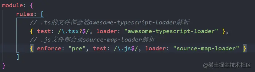 既然决定要使用TS,那么就可以通过webpack搭配ts-loader或者awesome-typescript-loader来对ts语言进行编译。相应的webpack配置文件也非常好写,这里就简单贴张截图。