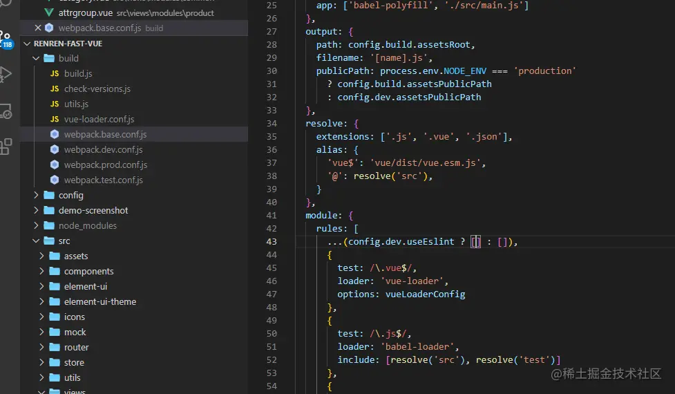 1、打开 build\webpack.base.conf.js 这个文件