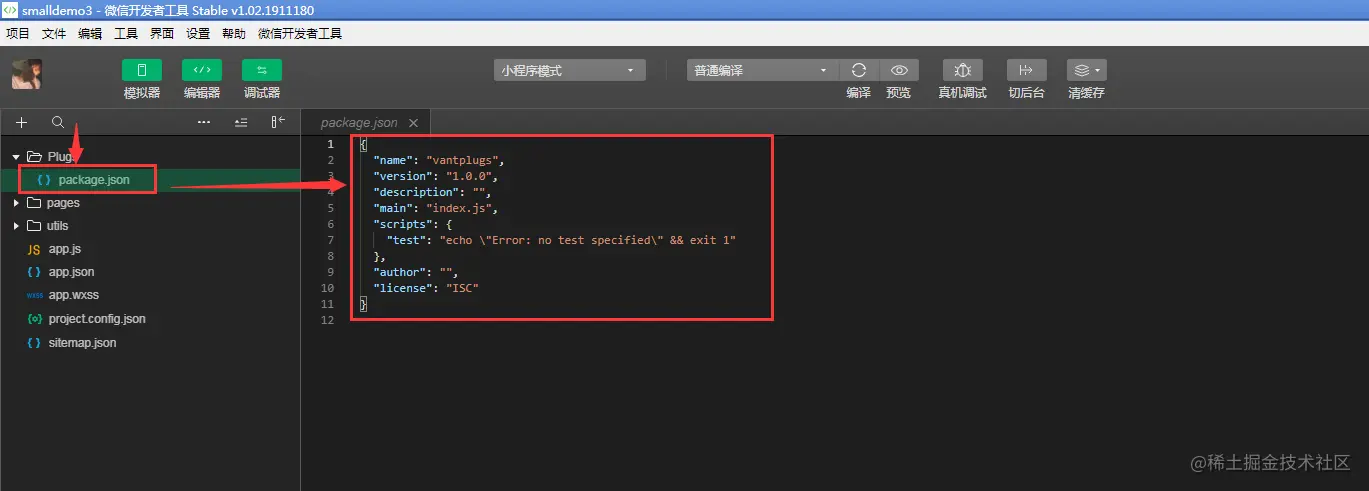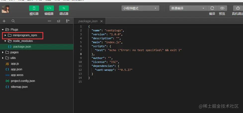 我们会发现在小程序的文件夹中自动创建了package.json。如图所示:
