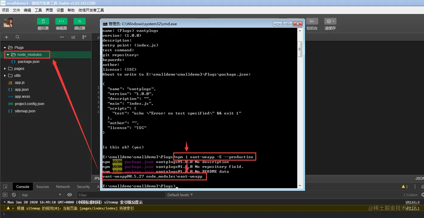 输入命令npm i vant-weapp -S --production 回车。如下图所示: