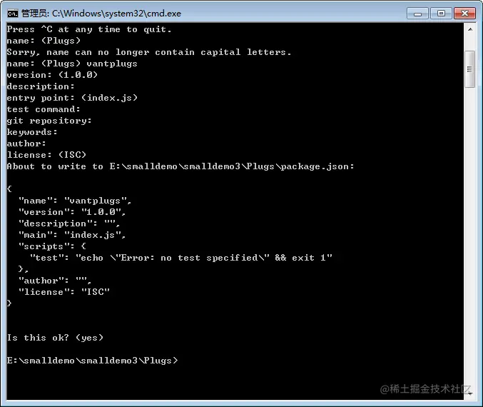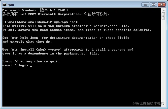 然后,在控制面板中输入 npm init 。如下图所示: