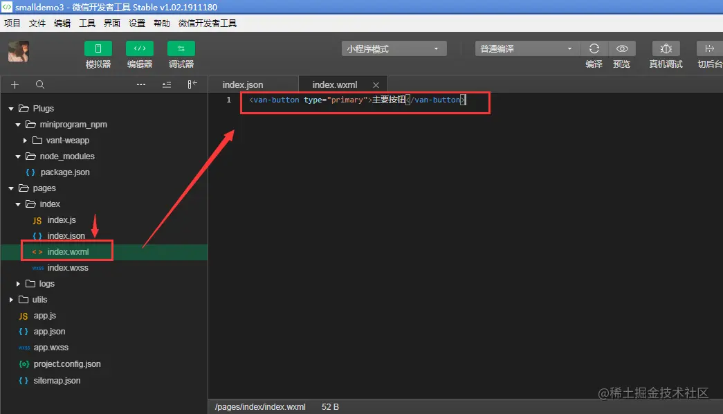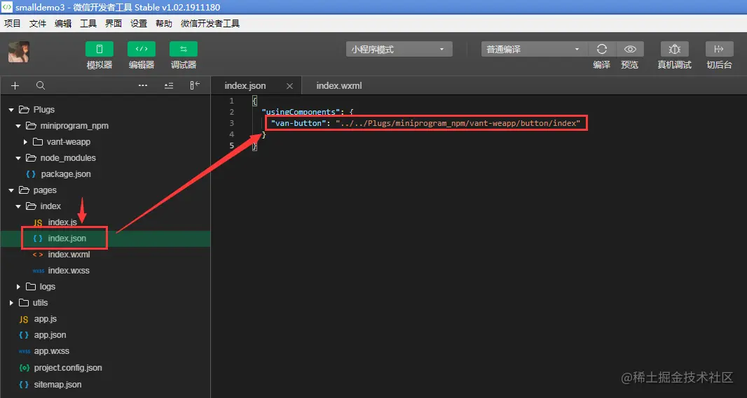 看了微信小程序的官网介绍可以引用第三方的组件库。但是,要求微信开发工具的版本必须要在2.2.10 以上的版本才可以。通过 npm 的方式引用Vant 移动端的组件库。