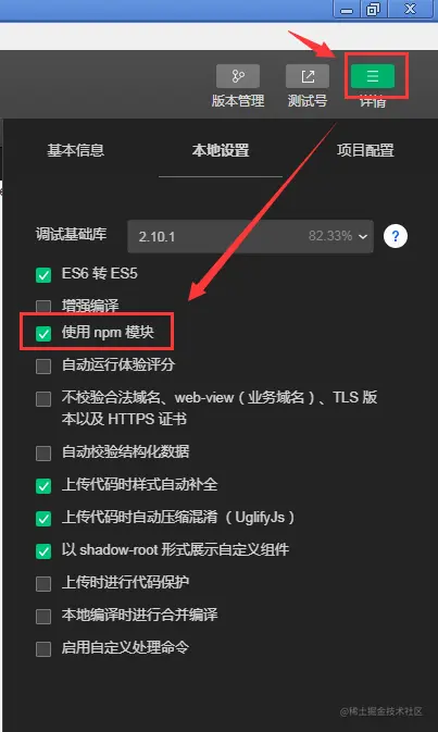 最后,需要在详情中勾选使用npm模块的选项。如图所示: