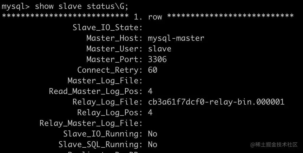 mysql-slave数据库,运行change master命令配置要同步的主库信息。CHANGE MASTER TO MASTER_HOST='mysql-master', MASTER_USER='slave', MASTER_PASSWORD='123456', MASTER_AUTO_POSITION=1; -