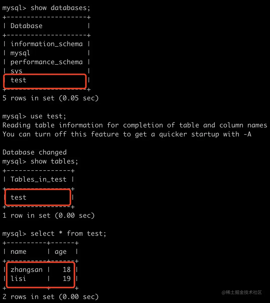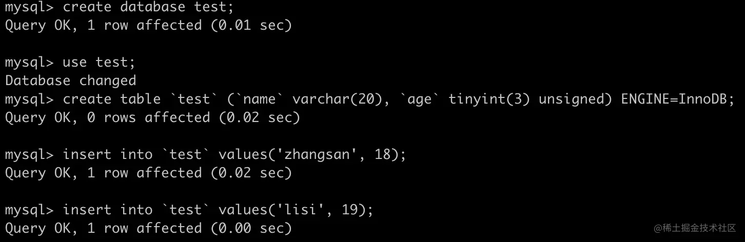 在主库中新建一个 test 数据库和 一个 test 数据表,并插入几条数据: