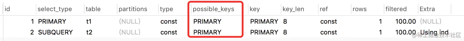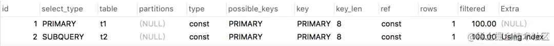 我们看到这条嵌套查询的sql中,最外层的t1表是PRIMARY类型,而最里面的子查询t2表是SUBQUERY类型。