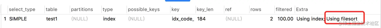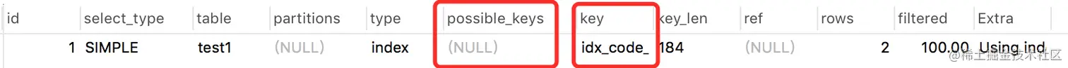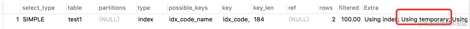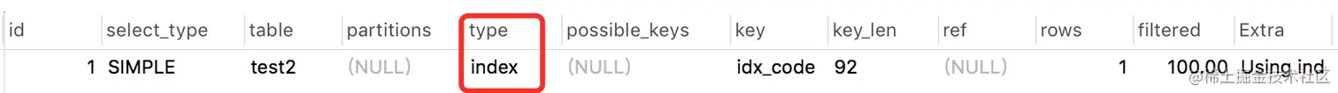 上面那个例子中其实就用到了:Using index,因为只返回一列code,它字段走了索引。