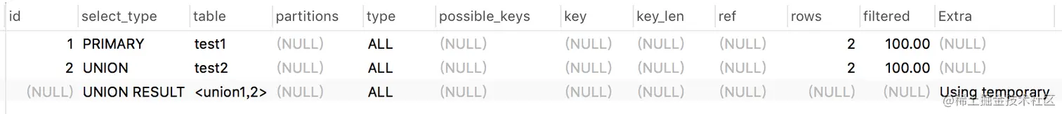 test2表是UNION关键字之后的查询,所以被标记为UNION,test1是最主要的表,被标记为PRIMARY。而<union1,2>表示id=1和id=2的表union,其结果被标记为UNION RESULT。