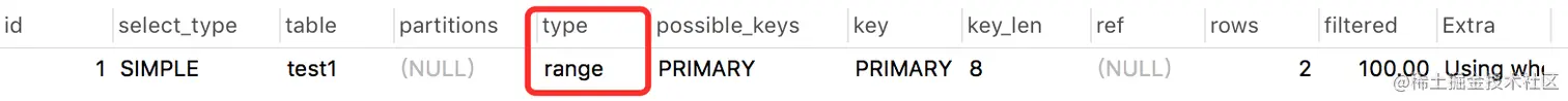 range 常用于范围查询,比如:between ... and 或 In 等操作,执行sql如下: explain select * from test2 where id between 1 and 2;