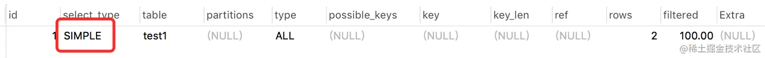 它只在简单SELECT查询中出现,不包含子查询和UNION,这种类型比较直观就不多说了。