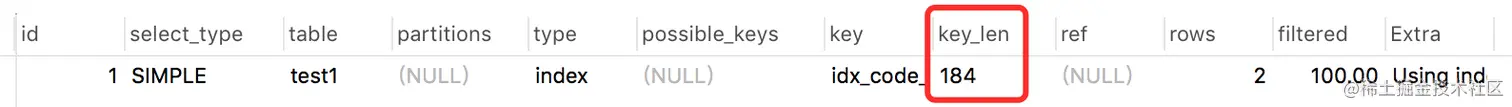 该列表示实际用到的索引。 可能会出现possible_keys列为NULL,但是key不为NULL的情况。