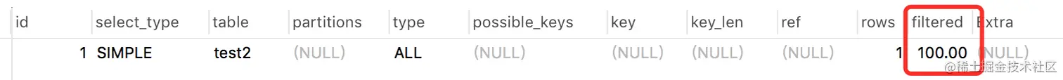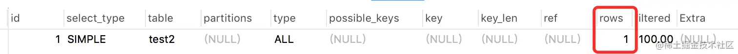 rows显示了检查的估计行数,rows× filtered显示了与下表连接的行数。例如,如果 rows为1000且 filtered为50.00(50%),则与下表连接的行数为1000×50%= 500。