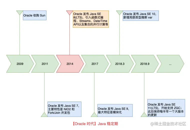 2009 年,Oracle 收购 Sun,Java 由 Oracle 继续维护。Java 的 Sun 时代终结,正式进入 Oracle 时代。
