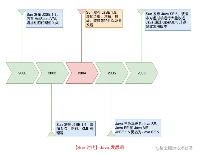 JDK 1.2 影响深远,Java 发生了很多革命性的变化,并且它的很多能力和规范沿用至今。至此,Sun 时代 Java 的初创期结束,进入了飞速发展的阶段。