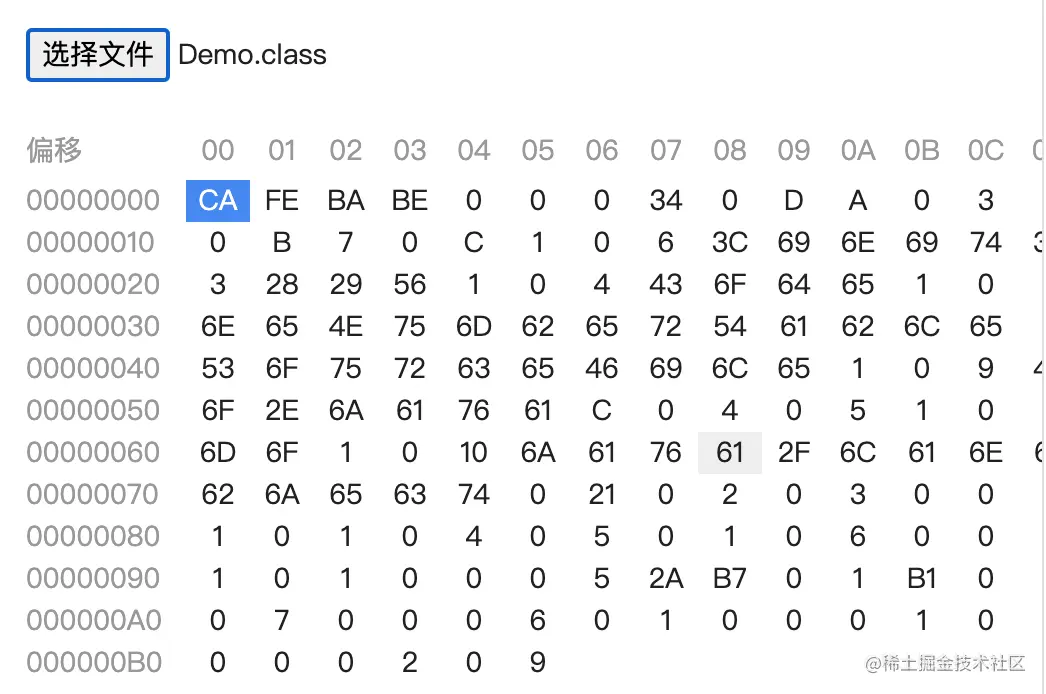 以下是我将 Demo.java 文件编译成 Demo.class 文件后,用网站工具看到的内容,感兴趣的同学可以亲自试下。