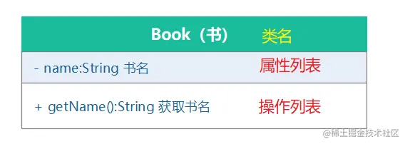 每一个属性或者操作具体格式为:[可见性权限] [属性或方法名]:[返回类型] [中文说明]。这里的 [中文说明] 在 UML 中并没有,这里为了方便理解,所以加上了中文说明。