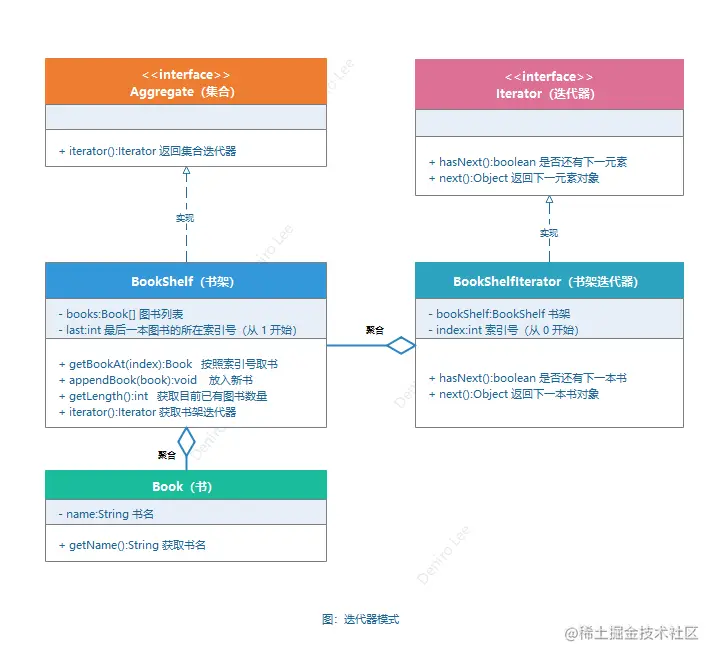 这里的关键点是 iterator() 方法,它会返回 BookShelfIterator 书籍迭代器类。这个方法接受一个 BookShelf 书架作为入参。 因为迭代器内部需要 bookShelf 来实现 hasNext() 与 next() 方法。