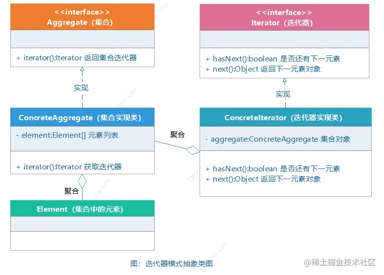 关键是定义了两个接口,一个是集合,另一个是用于迭代集合元素的迭代器。集合中包含多个元素。迭代器实现类拥有集合实现类对象,这样才能进行迭代操作。集合实现类提供返回迭代器的方法,这样外层客户端才能得到这个迭代器,进行元素迭代操作。