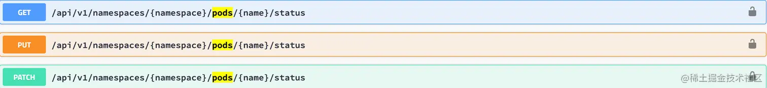 以及针对单个资源除了 增删改查以外的其他动作可由 `pods/status这样的接口获取。对应的openapi中的描述则为