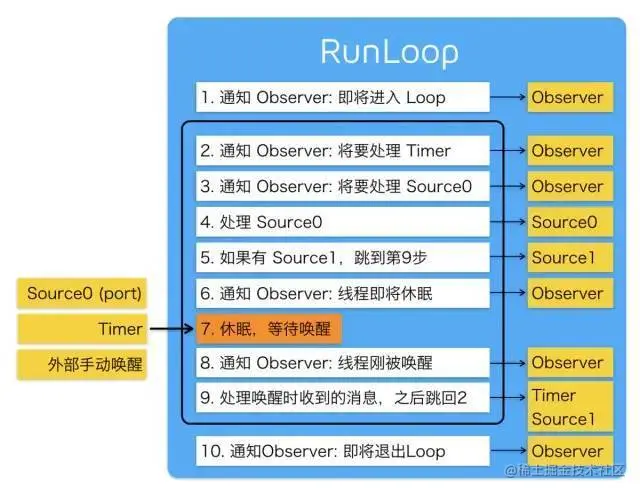 没有事情的时候,Runloop处于休眠状态。当外部source将其唤醒后,它会依次处理接收到的timer/source,然后再次进入休眠。