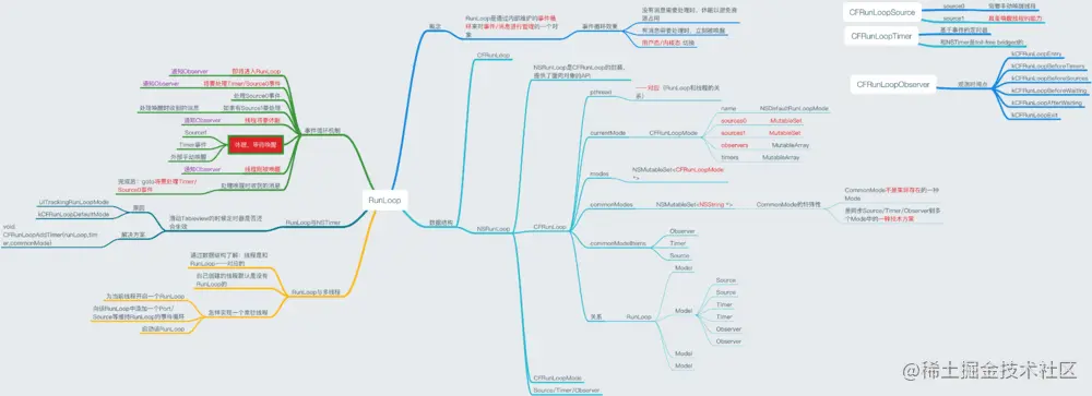 我相信大多数开发者一样,迷惑于runloop,最初只了解可以通过runloop一些监听事件的通知来做一些事情,优化性能。关于runloop源码的基础知识,可以参考下面的思维导图: