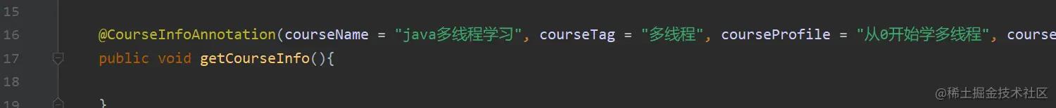 @CourseInfoAnnotation(courseName = "Java注解学习", courseTag = "注解", courseProfile = "零基础学习注解开发")