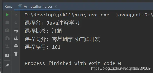 创建一个AnnotationParser 类, 用于解析注解的信息. 如下的代码 . 解析了上面的步骤中MyCourse类的, 标注在其类上的CourseInfoAnnotation注解的信息.