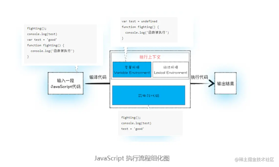 上一篇聊的,变量提升并不会真正的在物理层面移动到代码的最前面,而实际上变量和函数声明在代码里的位置是不会改变的,而且是在编译阶段被 JavaScript 引擎放入内存中。一段 JavaScript 代码在执行之前需要被 JavaScript 引擎编译,编译完成之后,才会进入执行阶段,js代码的大致执行的过程如下图: