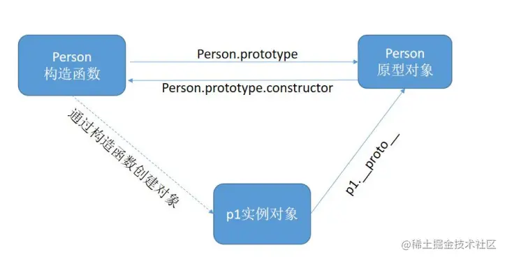 - 通过构造函数得到的实例对象内部会包含一个指向构造函数的prototype对象的指针__proto__。