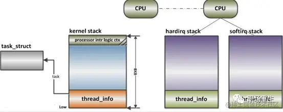 这样代码(指令)执行存在不同的CPU上下文,而进行调度的时候,要进行相应的CPU上下文切换,Linux系统存在不同堆栈来保存CPU上下文,系统中每个进程都会拥有属于自己的内核栈,而系统中每个CPU都将为中断处理准备了两个独立的中断栈,分别是hardirq栈和softirq栈: