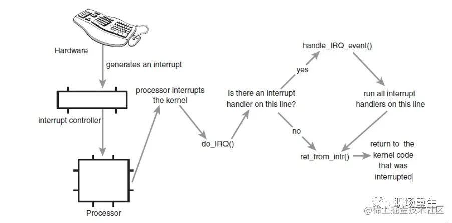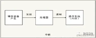 中断是由硬件设备产生的,而它们从物理上说就是电信号,之后,它们通过中断控制器发送给CPU,接着CPU判断收到的中断来自于哪个硬件设备(这定义在内核中),最后,由CPU发送给内核,内核来处理中断。
