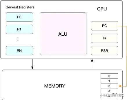 首先,我们有一个自动计数器。这个自动计数器会随着时钟主频不断地自增,来作为我们的 PC 寄存器;