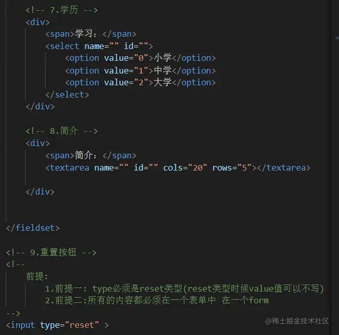 - 重置按钮 type=reset:重置它所属form的所有变淡元素(包括input textarea select)