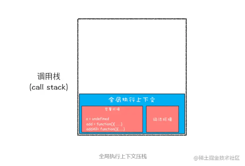 从图中你也可以看出,变量 a、函数 add 和 addAll 都保存到了全局上下文的变量环境对象中。