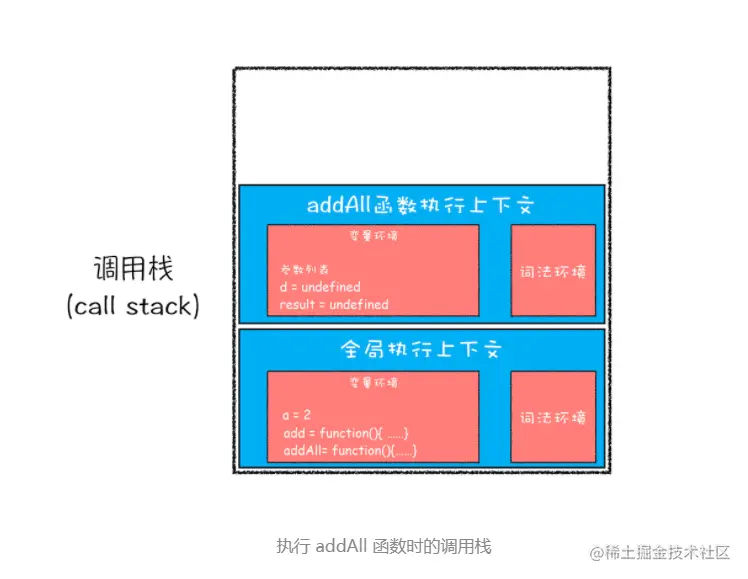 接下来,第二步是调用 addAll 函数。当调用该函数时,JavaScript 引擎会编译该函数,并为其创建一个执行上下文,最后还将该函数的执行上下文压入栈中,如下图所示: