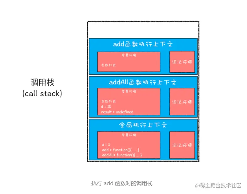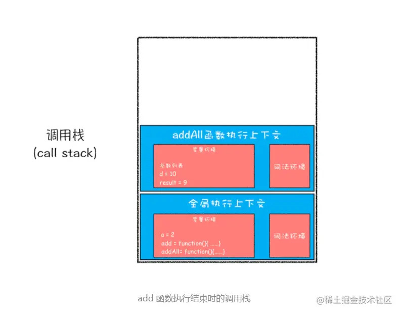 就这样,当执行到 add 函数的时候,我们就有了两个执行上下文了——全局执行上下文和 add 函数的执行上下文。