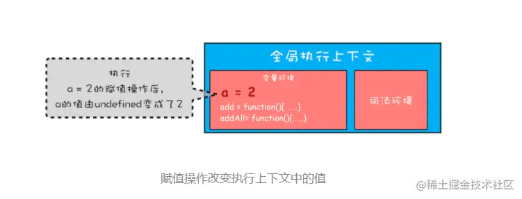全局执行上下文压入到调用栈后,JavaScript 引擎便开始执行全局代码了。首先会执行 a=2 的赋值操作,执行该语句会将全局上下文变量环境中 a 的值设置为 2。设置后的全局上下文的状态如下图所示: