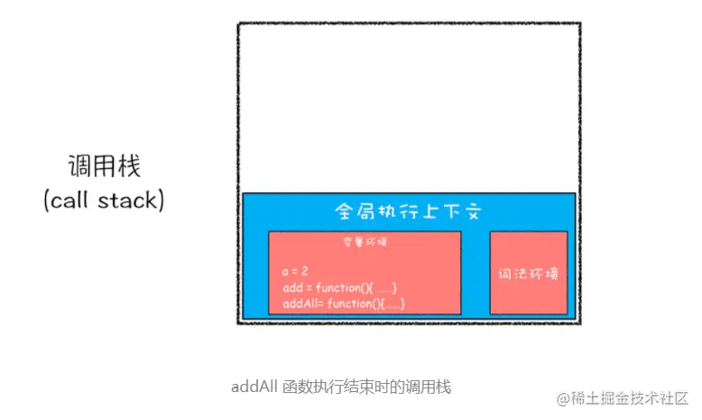 紧接着 addAll 执行最后一个相加操作后并返回,addAll 的执行上下文也会从栈顶部弹出,此时调用栈中就只剩下全局上下文了。最终如下图所示: