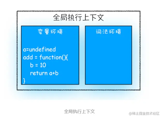 在执行到函数 add() 之前,JavaScript 引擎会为上面这段代码创建全局执行上下文,包含了声明的函数和变量,你可以参考下图: