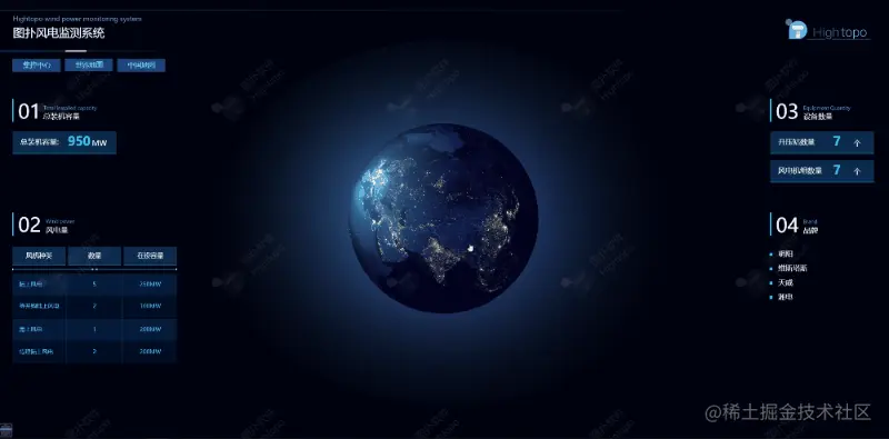 当我们点击面板上的任意风机,画面会切换至风力发电机的效果预览,风机呈现科幻风格,整体场景以2D 面板与3D 风机相结合。系统采用 HT 来构造轻量化的 3D 可视化场景,从不同的形态来还原风机的运行状况
