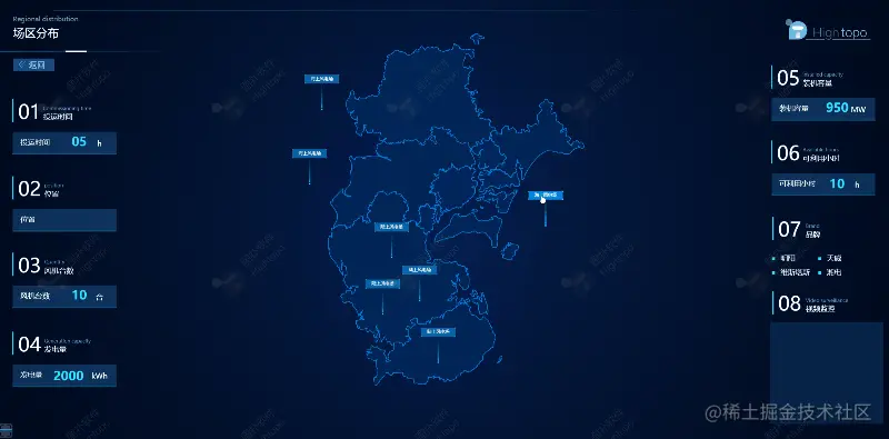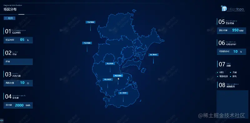 将多台大型并网式的风力发电机安装在风能资源好的场地,按照地形和主风向排成阵列,并向电网供电的机群。我们也可以利用HT结合GIS技术,在用地选址、路径规划、资源分配以及环境监测等方面,宏观上辅助决策分析,微观上监控管控。