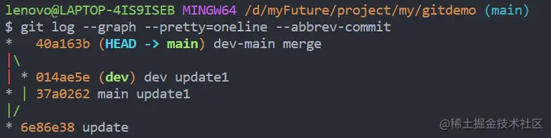 注: 在commit id后面有(HEAD -> main)字样的一串是提示你当前默认分支位于哪一个commit上