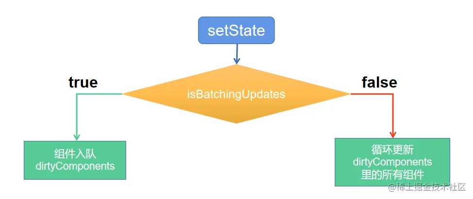 setState 设计是合并异步更新的。为什么是合并异步呢?如上的前后 this.setState({count: this.state.count + 1}); 执行了两次,如果没有这种合并异步机制,页面岂不是要立即刷新两遍。两次还好,来一个 for 循环做上一万次、十万次赋值操作那页面不是要卡死崩溃了。所以 setState 不是立即触发更新数据的,而是会先将这些 setState 合并起来,等到 “时机成熟”,执行更新。什么时候是 “时机成熟” 呢?有一个变量 isBatchingUpdates 来控制是否更新 state 的值。具体逻辑如下: