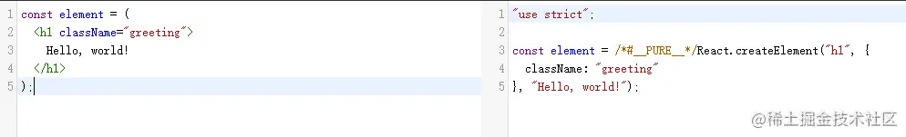 Babel 会把 JSX 转译成一个名为 React.createElement() 函数调用。我们可以理解 JSX 是 React.createElement() 函数的 语法糖。避免我们使用 React.createElement() 吭哧吭哧写 React.createElement() 函数需要的各种参数, JSX 语法以一种我们普遍能接受、学习成本低的、父子元素结构清晰的方式展示了我们想要表达的 “模板”。