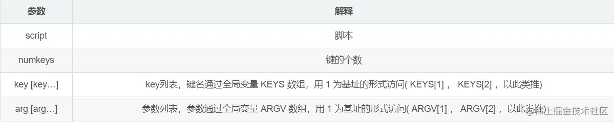 EVAL "return {KEYS[1], KEYS[2], ARGV[1], ARGV[2]}" 2 key1 key2 first second