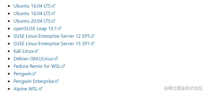 - WSL2安装十分简单,按照官方文档操作即可,支持的Linux系统种类也很丰富。