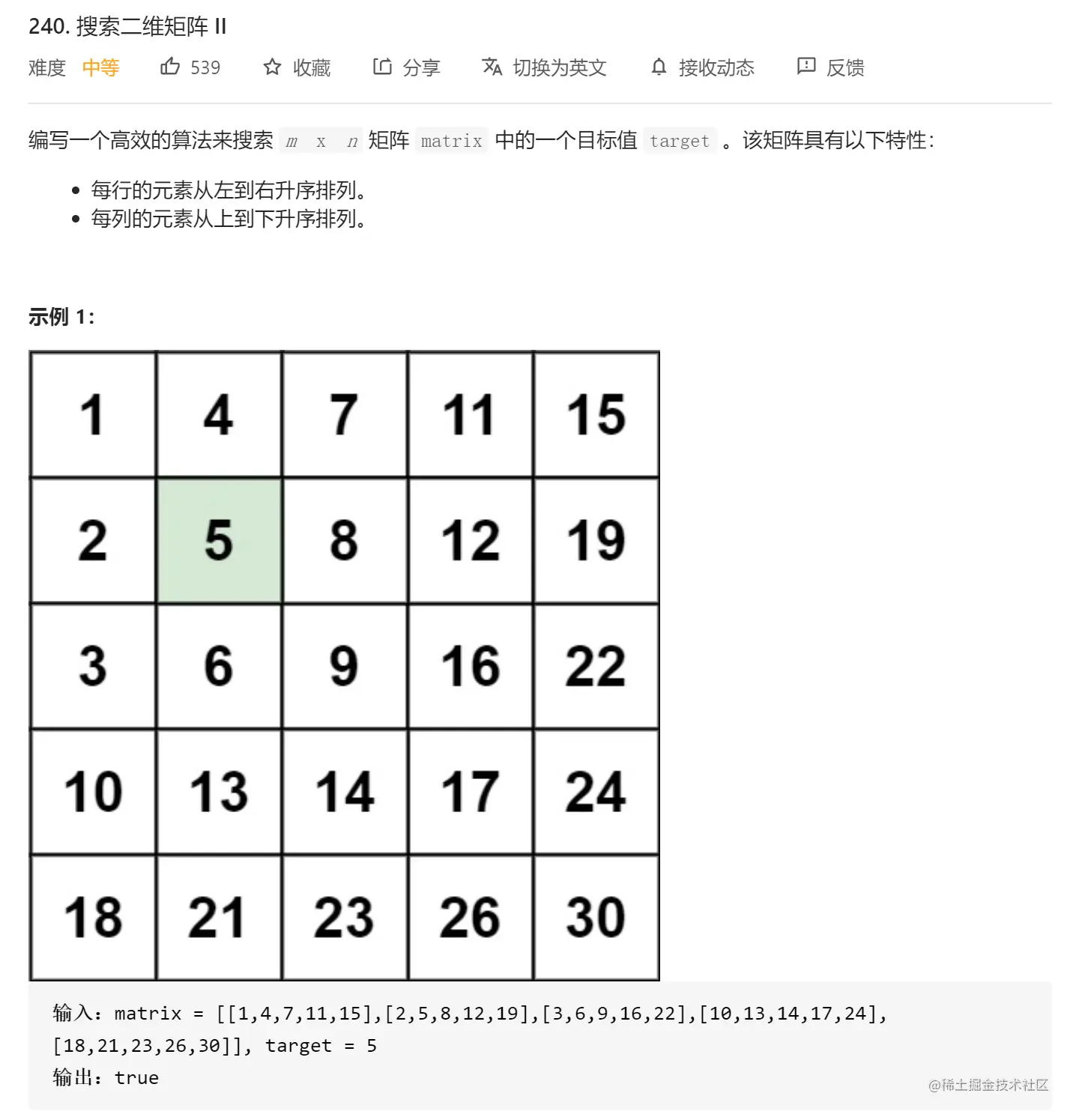 - 左下角的元素是这一行中最小的元素,同时又是这一列中最大的元素。比较左下角元素和目标: