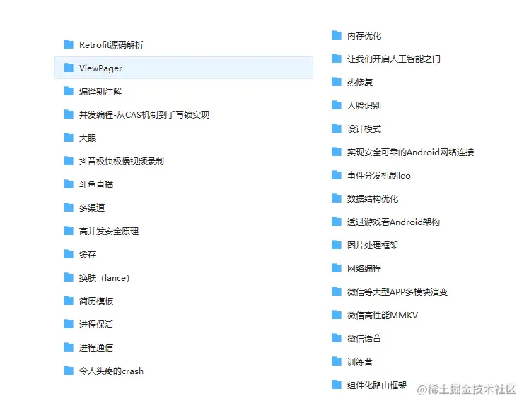 一共十个专题,包括了Android进阶所有学习资料,Android进阶视频,Flutter,java基础,kotlin,NDK模块,计算机网络,数据结构与算法,微信小程序,面试题解析,framework源码!
