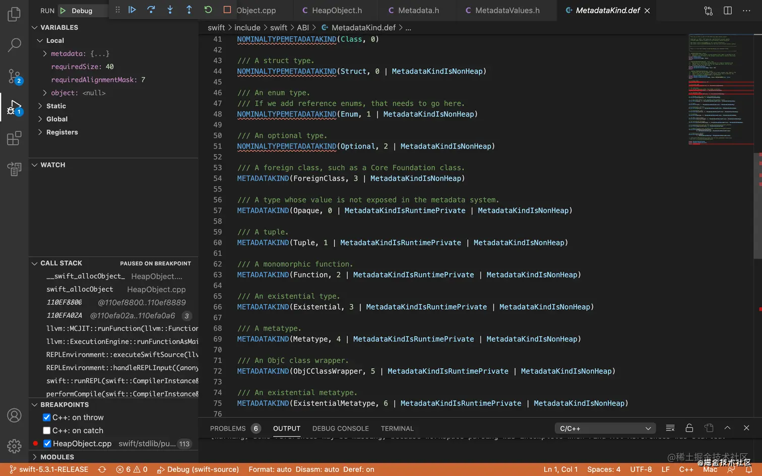 在上面的HeapObject介绍中看到其中包含一个metadata,查看它