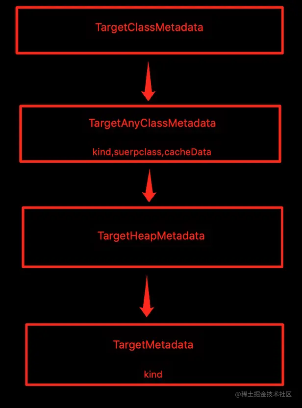 如果metadatade的枚举值是class 那他的就返回的是TargetClassMetadata,之后又继承自TargetAnyClassMetadata,再继承子TargetHeapMetadata再继承自TargetMetadata